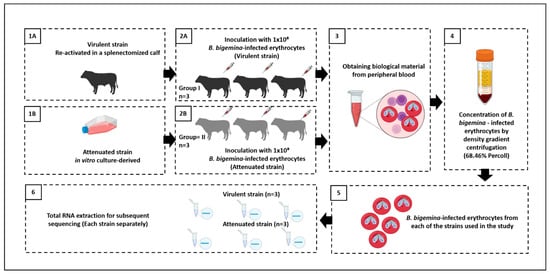 Illustration of the experimental design to obtain biological material for the research study. (1A) Activation of the B. bigemina virulent strain in a splenectomized calf. (1B) In vitro culture to obtain the B. bigemina attenuated (vaccine) strain. (2A,2B) inoculation of steers by deep intramuscular route, with the specified dose for each of the B. bigemina strains (n = 3, for both groups). (3) Obtaining the biological material from each of the inoculated steers. (4) Infected erythrocyte concentration performed with a 68.46% Percoll density gradient. (5) Concentration of infected erythrocytes. (6) Extraction of total RNA from each of the samples obtained (3 biological replicates for each B. bigemina strain).
