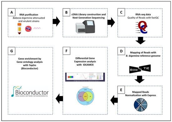 Workflow for the RNA-seq analysis of B. bigemina attenuated (vaccine) and virulent strains. (A) Sample preparation (total RNA). (B) Sequencing with the Illumina MiSeq Next Generation Sequencing Technology platform (Sanger/Illumina 1.9), obtaining the sequence “reads” in fastq formats. (C) Primary analysis using the FastQC program (version 0.11.5). (D) Cleanup of sequence reads by filtering out reads that mapped to the Bos taurus genome (GCF_002263795.1), and alignment of the filtered reads by mapping to the B. bigemina reference genome (GCF_000981445.1). (E) Quantitation and normalization of data. (F) Differential expression analysis with the IDEAMEX platform, using the edgeR, DESeq2 and NOISeq programs. (G) Functional annotation performed by assigning the gene ontology (GO) categories, with the R program “TopGO” (v2.46.0). (Partial images supported by BioRender.com) (accessed on 2 November 2023).