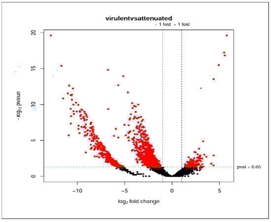 Volcano plot of differentially expressed genes (DEGs) between virulent and attenuated strains of Babesia bigemina. The X-axis is the logarithmic scale 2 of the fold change in gene expression (log2 (fold change)). The Y-axis is the log10-adjusted p-value, indicating the level of significant difference in expression. Black dots represent genes without differential expression; red dots represent differentially increased genes based on p-adj and logFC cut-off values.