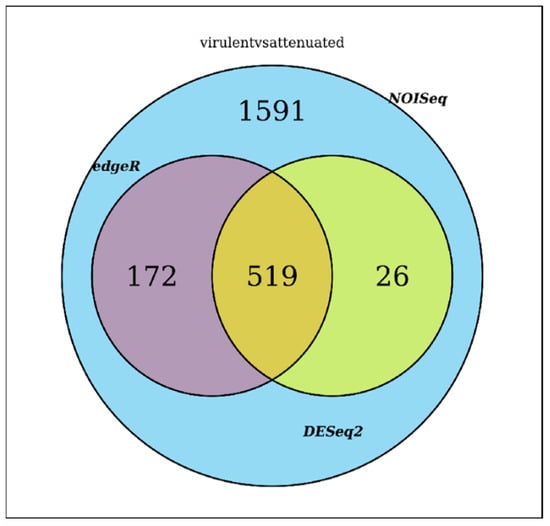 The RNA-seq reads were mapped against the reference genome of the B. bigemina BOND strain. Concerning the similarity and variation between the biological replicates, the multidimensional scaling (MDS) method reveals a significant similarity, particularly among the triplicates belonging to the virulent strain (Supplementary Figure S4). Additionally, a slightly larger count per million (CPM) was obtained in these than in the attenuated strains, as shown in Supplementary Figure S5. The global assembly of the Babesia bigemina mapped transcripts was used for the differentially expressed gene (DEG) analysis. The DEGs were identified with the criteria of log2 (fold change) > 2 and an adjusted p-value < 0.01 for comparing differential expression patterns between the virulent strain and the attenuated strain of B. bigemina. A total of 3544 genes were detected, with 691 identified using the edgeR software (version 4.0.16), 2308 with NOIseq (version 1.42.1), and 545 with DESeq2 (version 1.42.1). The results of the total differentially expressed genes between the two Babesia bigemina strains can be visualized in the volcano plot, represented with red dots (Figure 3).