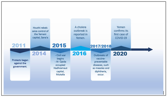 Yemen was weakened due to the ongoing civil war, and the COVID-19 pandemic exacerbated the situation [21,22]. Yemen faces a complex multifaceted situation; the war and the pandemic have significantly affected the achievement of SDG 3 and other SDGs, such as SDG 1 (No Poverty), SDG 2 (Zero Hunger), and SDG 6 (Clean Water and Sanitation). Figure 1 illustrates the main conflict events and health issues in 2011–2020 that influenced the deterioration of health facilities and services.