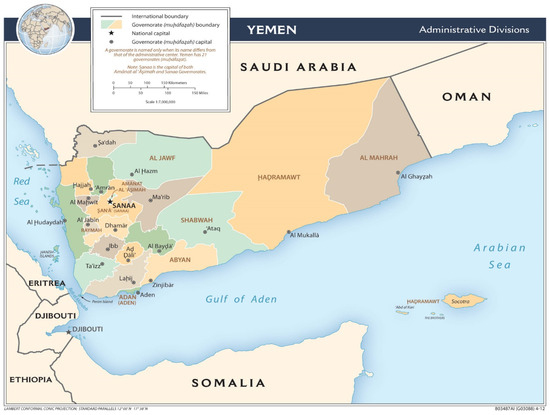 - Free Map Viewer. Map—Yemen. Available online: https://www.freemapviewer.org/en/map/Map-Yemen_189.html#google_vignette (accessed on 10 March 2024).