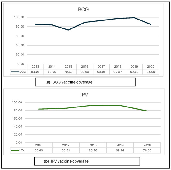 Vaccination coverage of single-dose vaccines (BCG (a) and IPV (b)) in Coastal Hadhramaut in 2013–2020.