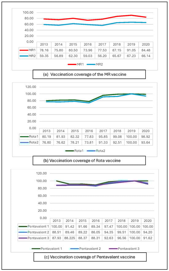 Vaccination coverage of multidose vaccines (MR (a), rotavirus (b), and pentavalent (c)) in Coastal Hadhramaut in 2013–2020.
