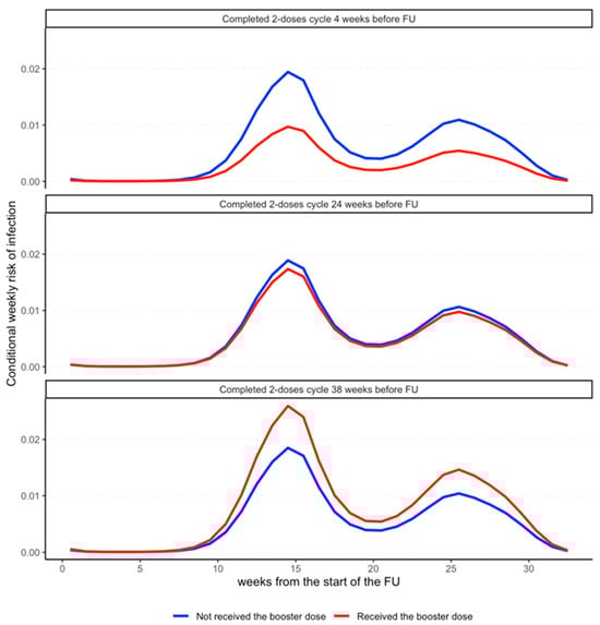 As expected, the weekly risk of SARS-CoV-2 infection during the follow-up exhibited a distinct multi-peaked shape, with a major peak of the risk of infection at 15 weeks from the start of the booster campaign (January–February 2022) and a minor peak at 25 weeks (April 2022).
