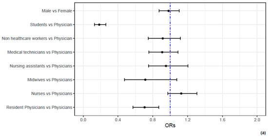 The interaction between time from the completion of the vaccination cycle and booster dose administration was significant (p = 0.0014). Adjusted for the modulating effect of the time from completion of the vaccination cycle, the protective effect of the booster dose was evident, OR = 0.45, 95% CI [0.22, 0.91]. As shown in the analysis before, the modulating effect was both quantitative and qualitative, as the longer the time from the completion of the vaccination cycle, the less evident the protective effect of booster dose administration, leading to a flip in the risk profiles (Figure 1). Also, in this case, previous infection was highly associated to the risk of infection during follow-up. Figure 2 reports the ORs for sex, occupational characteristics and age. While sex is not associated to the risk of infection, age and occupational characteristics are. Indeed, compared to physicians, students and resident physicians display a significantly lower risk of infection. On the contrary, nurses display a higher risk of infection. In addition, age between 30 and 45 years is associated to higher risk of infection; on the other hand, age over 45 years is associated to a lower risk of infection.