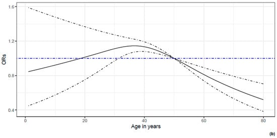 The exponentiated coefficients of the respective models related to the covariates offered the odds ratio (OR) of being infected with SARS-CoV-2 between covariate categories. For the sub-analysis, a forest plot represented the effect of the demographic categorical covariates, whereas the continuous non-linear effect of age was shown in a separate plot.