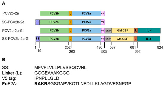 A new bivalent PCV2 immunogen was designed by joining consensus amino acid sequences of Cap2a to the C-terminus of Cap2b, designated PCV2b-2a. The two proteins are linked together via an alpha helical linker to allow a separation of the two proteins to maintain their functions [32,33]. V5 tag sequence was fused to the C-terminus of the fusion protein as shown in Figure 1 and Supplementary Figure S2. With the aim to maximize potency of the PCV2b-2a immunogen, we further modified the immunogen with the signal sequence (SS) and molecular adjuvants GM-CSF and IL-4. To target the protein to secretory pathway, a signal sequence derived from SARS-CoV-2 spike (accession no. MN996527.1), which was previously used to mediate extracellular secretion of our immunogens with high success, was fused to the N-terminus of the immunogens. Porcine GM-CSF and IL-4 were combined as a fusion protein (GI) with an alpha helical linker connecting the two proteins. The fusion protein GI was added to the C-terminus of the PCV2b-2a immunogen. A self-cleaving peptide derived from foot-and-mouth disease virus protein, F2A [34], with a furin (Fu) cleaving sequence (RAKR) [34,35] that we previously demonstrated as having high efficiency in mediating self-cleavage of co-expressed PRRSV proteins [36], was included between the immunogen and GI. The F2A mediates self-cleavage of the co-expressed immunogen and GI, while Fu site mediates trimming of the F2A from the immunogen. With all these modifications, we generated 4 bivalent immunogen constructs: (i) PCV2b-2a, (ii) SS-PCV2b-2a, (iii) PCV2b-2a-GI, and (iv) SS-PCV2b-2a-GI (Figure 1).