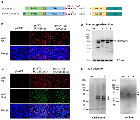 Expression of the immunogen by 4 different constructs. HEK-293A cells were transfected with 1 µg of the pVAX1 plasmids harboring 4 different immunogen constructs. Cells and medium were collected and tested for protein expression at 48 h post-transfection. (A) Schematic diagram of the protein products produced by the constructs bearing the fusion gene GI. Proteins PCV2b-2a and GI are cleaved during translation, which is mediated by F2A. Red arrow indicate furin cleavage site; blue arrow indicates F2A cleavage site. (B) Immunofluorescence assay detecting the PCV2b-2a immunogen expressed by the two constructs: PCV2b-2a and SS-PCV2b-2a. (C) Immunofluorescence assay detecting the immunogen and fusion cytokine GI expressed by the two constructs: PCV2b-2a-GI and SS-PCV2b-2a-GI. (D) Western blot analysis of the PCV2b-2a fusion protein expressed by all 4 constructs in the cell lysate. PCNA was also detected and used as an internal control. (E) Western blot analyses of the fusion cytokine GI expressed from the two constructs bearing the fusion gene GI. Both cell lysate and medium were tested. The PCV2b-2a, GI and PCNA proteins were detected using anti-V5 mAb, anti-IL-4 mAb, and anti-PCNA mAb, respectively, in both immunofluorescence staining and Western blot. Cell nuclei were stained with DAPI (blue fluorescence). In Western blot, the cells transfected with the plasmid pVAX1 expressing PCV2b-2a, PCV2b-2a-GI, SS-PCV2b-2a, and SS-PCV2b-2a-GI are indicated as 1, 2, 3, and 4, respectively. The HEK-293A cells transfected with parental plasmid pVAX1 were used as a negative control (-ve).