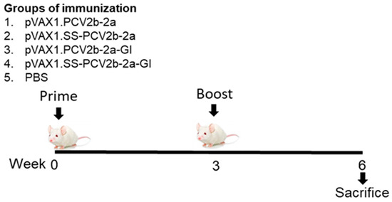 Animal experiments were carried out under the regulation and permission of the National Laboratory Animal Center (NLAC), Mahidol University, IACUC protocol number RA2022-16. Female 6-week-old BALB/cAJcl mice were purchased from Nomura Siam International Co., Ltd, Bangkok, Thailand. Five mice of each group were intramuscularly (i.m.) injected into thigh muscles of both hind limbs with 100 µg of recombinant DNA diluted in 100 µL of PBS. Recombinant DNA used for injection were pVAX1.PCV2b-2a, pVAX1.SS-PCV2b-2a, pVAX1.PCV2b-2a-GI, and pVAX1.SS-PCV2b-2a-GI. In addition, a group of five female BALB/cAJcl mice was injected with PBS (100 µL) and used as a negative control group. Mice were immunized twice with a 3-week interval. Blood and spleen samples were collected 3 weeks after the second immunization.