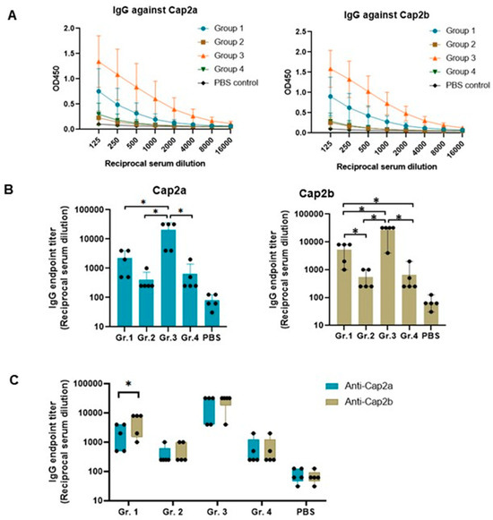 Endpoint titer of total IgG antibody was examined using capsid proteins, Cap2a and Cap2b, expressed individually in E. coli (Supplementary Figure S3). The optimal amount of protein used for coating plates was studied and 5 µg protein/well was chosen to be used in ELISA (Supplementary Figure S4). A 2-fold serial dilution of serum samples (1:125–1:16,000) was tested in ELISA (Figure 5A). Mice immunized with pVAX1.PCV2b-2a-GI (Gr. 3) exhibited the highest Cap2a- and Cap2b-specific antibody responses with endpoint titer means of 20,800 and 26,400, respectively, followed by the group immunized with pVAX1.PCV2b-2a (Gr. 1) with IgG endpoint titer means against Cap2a and Cap2b of 2200 and 5400, respectively (Figure 5B). The immunogen constructs, SS-PCV2b-2a (Gr. 2) and SS-PCV2b-2a-GI (Gr. 4), induced a much lower total IgG response with endpoint titer means against Cap2a and Cap2b both lower than 700. Based on OD450 mean, three groups of immunized mice (groups 1 to 3) exhibited higher antibody response against Cap2b than Cap2a, although only the response in group 1 was statistically significant (p < 0.05) (Figure 5C).