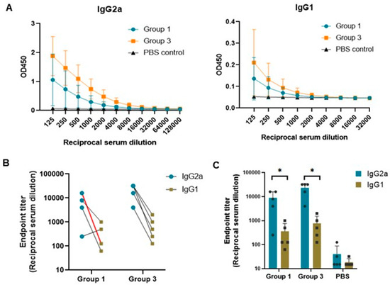 Further, we assessed whether the immune response induced by the two immunogen constructs, PCV2b-2a (Gr. 1) and PCV2b-2a-GI (Gr. 3), is Th1- or Th2-biased, which is indicated by IgG2a and IgG1, respectively [39]. We performed ELISA using anti-mouse IgG2a and IgG1 as secondary antibodies with 2-fold serially diluted sera. The result showed that the OD450 of IgG2a were markedly higher than that of IgG1 with a IgG2a:IgG1 ratio as high as 128 in several mice of both groups (Figure 6A). Endpoint titers of the IgG2a were in the range of 250 to 32,000, while those of the IgG1 was in the range of 62 to 2000 (Figure 6B,C). These results strongly confirm that PCV2b-2a-based DNA vaccines, regardless of the presence of the GI fusion cytokine, skewed immune responses towards a Th1 phenotype.