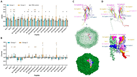 Antibody responses against predicted linear B cell epitopes and determination of immunodominant epitopes. (A) IgG response against individual predicted linear B cell epitopes. (B) Determination of immunodominant epitopes based on Z-score. Black dot (●) in (A,B) represents value of individual mouse. Serum samples (diluted 1:100) from mice immunized with pVAX1.PCV2b-2a (group 1), pVAX1.PCV2b-2a-GI (group 3), and the PBS control group were tested with synthetic peptides corresponding to the predicted linear B cell epitopes of Cap2a and Cap2b as indicated in X-axis. Antibody responses from each mouse are shown. Ref-1 to Ref-3 are published epitopes and used as referenced epitopes. A peptide showing Z-score mean > 0.04 (cutoff indicated by dashed line (--)) was considered immunodominant. Asterisk (*) indicates a significant difference between immunized group and PBS control group (p < 0.05). Octothorpe (#) indicates immunodominant epitope. (C) Three-dimensional structure of the natural PCV2 capsid protein (PDB 3R0R) showing in monomeric form (top panel) and assembled PCV2 capsid (middle panel) with surface exposure (bottom panel). (D) Three-dimensional structure of the immunogen PCV2b-2a showing secondary structure component (top panel) and surface exposure (bottom panel). The immunodominant epitopes are depicted on both proteins with different colors.