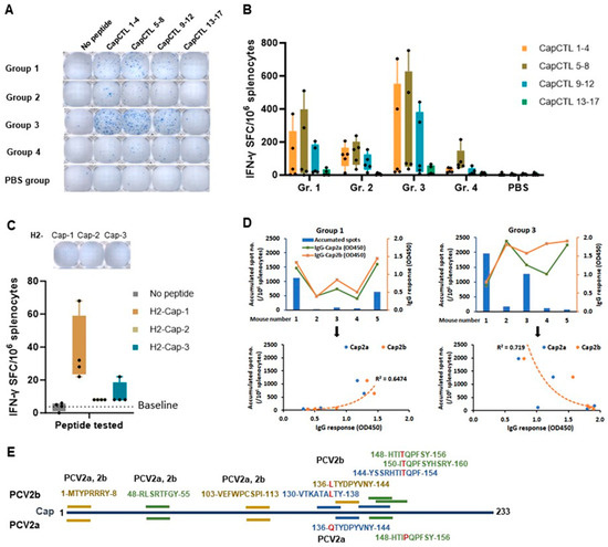Cellular immune responses in immunized mice. IFN-γ ELISpot was performed by re-stimulating the splenocytes with either single or pooled peptides of predicted CD8 T cell epitopes. (A) Representative of ELISpot wells of each group obtained from re-stimulating the splenocytes with four CapCTL peptide pools. (B) Frequencies of IFN-γ-producing cells (spot-forming cell (SFC) in response to CapCTL peptide pools). (C) Frequencies of IFN-γ-producing cells in response to single peptides, H2-Cap-1 to 3. Spot number in each group of figures (B,C) is presented in box and whisker plot, by which the middle 50% of scores for the group is indicated in box. Black dot (●) represents spot number of individual mouse. (D) Correlation of the T cell response and antibody response (total IgG) of groups 1 and 3. Accumulated spot number (in primary Y-axis) and total IgG (presented as OD450) against Cap2a and Cap2b (in secondary Y-axis) of each mouse in the groups (X-axis) are shown. (E) Position and sequence of putative CD8 T cell epitopes. Peptides with potential to be CD8 T cell epitopes were obtained by subtracting peptides in reactive pools (pools CapCTL-1–4 (orange), 5–8 (green), and 9–12 (blue)) with non-reactive pool (CapCTL-13–17) and H2-Cap peptides that share amino acid residues and are located at the same positions. Letter in red indicates a residue that is different between Cap2a and Cap2b.
