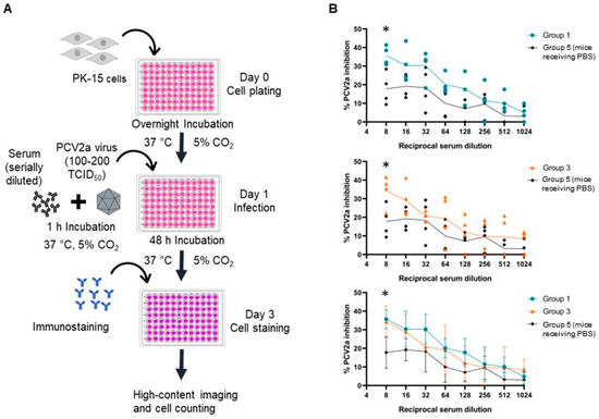 Antibody neutralization assay against PCV2a. (A) Schematic representation of antibody neutralization assay against PCV2a. Serum samples collected from different groups of immunized mice were 2-fold serially diluted in MEM to the dilution ranging from 1:8 to 1:1024 and incubated with a predetermined amount of PCV2a (100 TCID50) for 1 h at 37 °C. Subsequently, the virus–serum mixtures were added to PK-15 cells. The cells were incubated for 48 h, after which the infection was analyzed by immunofluorescence staining. The fluorescence spots were directly captured via Opera Phenix High-Content Screening System and counted via Columbus Server using the cell count function. The assay was conducted in technical duplicates. (B) Inhibition percentage of serially diluted sera against PCV2a viruses. Inhibition by each serum sample of groups 1 and 3 are shown in the two top panels with mean value at each dilution. Means with standard deviations of each group are shown (bottom panel). Asterisk (*) indicates a significant difference between the immunized group and the PBS control group (p < 0.05).