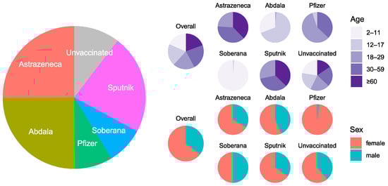 Distribution of vaccines by type, age, and sex. Participants characteristics by type of vaccine and unvaccinated. Relative distributions by type of vaccine and unvaccinated, including stratification by age groups and sex.