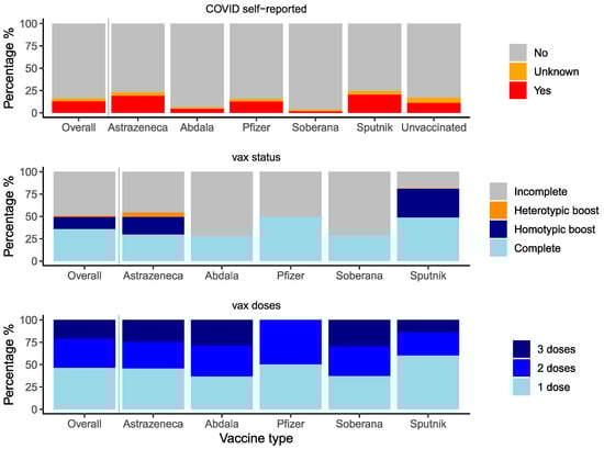 Distribution of self-reported COVID-19, vaccination status and number of doses. Distribution of self-reported COVID-19, vaccination status, and number of doses of the study population.