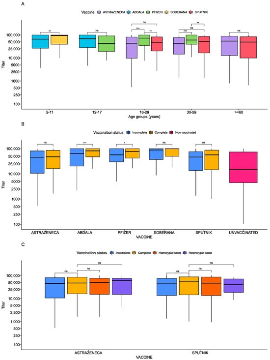Levels of antibodies among vaccinated individuals varied based on vaccine type. Soberana vaccinees had the highest anti-spike titers (MD = 36,498.8, 95% CI = [20,312.2, 52,685.5]), followed by Abdala vaccinees (MD = 25,889.9, 95% CI = [10,884.1, 40,895.7]) and Pfizer vaccinees (MD = 12,967.2, 95% CI = [7543.7, 18,390.8]). All three groups had higher anti-spike titers than AstraZeneca vaccinees (p-value < 0.0001 for each; Table 3) after adjusting for age, sex, vaccine status, days after last dose, and self-reported SARS-CoV-2 infection. Sputnik and AstraZeneca vaccinees had comparable titers (p-value = 0.959). We next compared the vaccine response across different age groups, and found higher anti-spike titers in 2–11-year-olds vaccinated with Soberana compared to those vaccinated with Abdala (p < 0.01) (Figure 3A). In 12–17-year-olds, antibody titers were comparable among Pfizer, Abdala, and AstraZeneca vaccines (p = 0.278). Among adults (18–29), Pfizer vaccinees had titers exceeding those vaccinated with AstraZeneca (p < 0.001) and Sputnik (p < 0.01), but no difference was observed between AstraZeneca and Sputnik vaccinees. These trends were repeated in the 30–59 age group. In populations over 59, AstraZeneca and Sputnik again showed similar responses (Figure 3A).