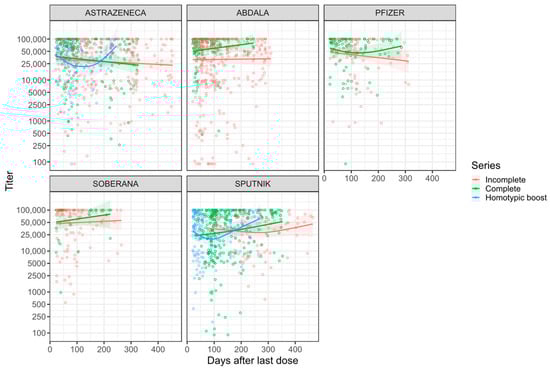 A stratified analysis, adjusting for age, showed no waning for most vaccine types and, in some instances, there was an increase (Figure 4). Sputnik vaccinees showed an increase of antibody levels over time that is statistically significant for both completely and incompletely vaccinated individuals with titer changes of 57.2/day [20,892.3/year] and 51.2/day [18,700.8/year], respectively (Supplemental Table S5, Figure 4). Homotypically boosted AstraZeneca and completely vaccinated Abdala vaccinees also had a substantial increase in the average antibody levels over time (Supplemental Table S5, Figure 4).
