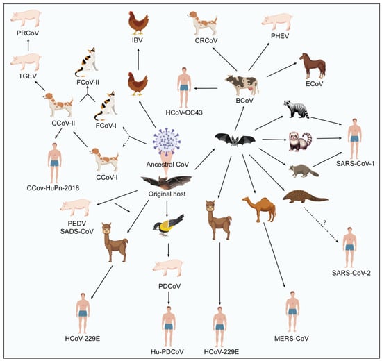 CoVs are established pathogens that have been identified as the causative agents of respiratory and gastrointestinal illnesses in both animals and humans. Human coronaviruses (HCoVs) have been acknowledged as significant contributors to respiratory tract infections globally since their discovery in the 1960s. To date, there are nine known CoVs that infect humans, namely human coronavirus 229E (HCoV-229E), human coronavirus OC43 (HCoV-OC43), human coronavirus NL63 (HCoV-NL63), human coronavirus HKU1 (HCoV-HKU1), severe acute respiratory syndrome coronavirus (SARS-CoV), Middle East respiratory syndrome coronavirus (MERS-CoV), canine coronavirus-human pneumonia-2018 (CCoV-HuPn-2018), human porcine delta coronavirus (Hu-PDCoV), and the newly identified severe acute respiratory syndrome coronavirus 2 (SARS-CoV-2) (also known as 2019-nCoV) [,,,]. Apart from the human coronavirus, there are also animal coronaviruses. Animal coronaviruses have been identified in a wide range of domestic and wild animal species, including birds, pigs, cattle, dogs, cats, rodents, and bats (Figure 1). It is known that not only human coronaviruses pose a threat to public health, but animal coronaviruses also continue to emerge and cause diseases [,,,]. Certain coronaviruses found in animals have the potential to induce significant morbidity and mortality in their respective hosts, exemplified by pathogens like the porcine epidemic diarrhea virus (PEDV) and the feline infectious peritonitis virus (FIPV). Furthermore, there exists compelling evidence suggesting zoonotic transmission of several human coronaviruses, with animal reservoirs serving as their likely origins. Notably, the SARS-CoV outbreak of 2002–2003 was traced back to bats in China [,,], while dromedary camels in the Middle East were responsible for the MERS-CoV outbreak in 2012 []. Although several plausible candidates have been proposed, there is no clear evidence for the involvement of specific animal intermediate hosts in the origin of SARS-CoV-2 [,,]. In addition, zoonotic transmission has been documented for HCoV-OC43 (from cattle to humans) and potentially for HCoV-229E, with a suggested transmission route from bats to humans through camels [,,]. The transmission of zoonotic viruses between humans and animals results in the development of severe respiratory diseases, including acute respiratory distress syndrome (ARDS) and pneumonia, often resulting in fatalities []. Hence, the inter-species transmission of animal coronaviruses to humans represents a critical concern, as it can precipitate the emergence of novel viral strains with pandemic capabilities (Figure 1).
