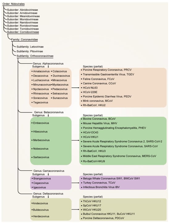- Woo, P.C.Y.; de Groot, R.J.; Haagmans, B.; Lau, S.K.P.; Neuman, B.W.; Perlman, S.; Sola, I.; van der Hoek, L.; Wong, A.C.P.; Yeh, S.-H. ICTV Virus Taxonomy Profile: Coronaviridae 2023. J. Gen. Virol. 2023, 104, 001843. [Google Scholar] [CrossRef]