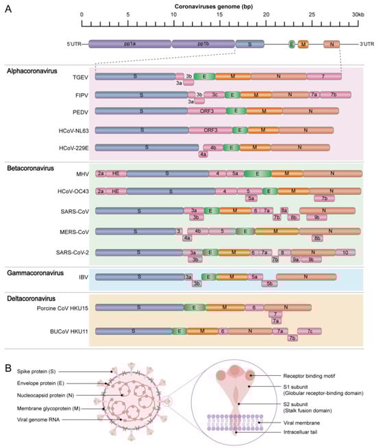 Much like their human counterparts, animal CoVs have a genome consisting of a linear, positive-sense, single-stranded RNA of approximately 22,000 to 36,000 nucleotides, with a 5′-cap structure and a 3′-polyadenylated tail []. They have a genome structure that comprises two open reading frames (ORFs) located in the 5′-proximal two-thirds of the genome [,,]. These ORFs, known as ORF1a and ORF1b, encode the replicase polyproteins pp1a and pp1ab [], as shown in Figure 3. The 3′-proximal one-third of the genome encodes four structural proteins: S, E, M, and N, along with several accessory proteins []. Some coronaviruses also have an additional structural protein called the hemagglutinin-esterase (HE) protein, which is acquired through recombination events (Figure 3A) [].