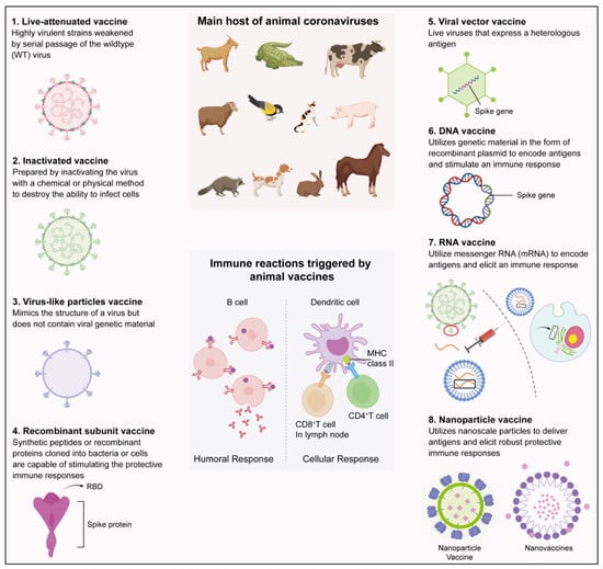 Hence, the ideal vaccine against coronaviruses should elicit the generation of neutralizing antibodies that impede viral attachment and entry into host cells, along with provoking cellular immune responses capable of eliminating infected cells. In light of the limited extent of research in this field, the imperative for the development of a “dual-effect” animal coronavirus vaccine that can effectively stimulate both cellular and humoral immune responses has emerged within the realm of vaccine advancement []. Presently, most vaccines developed for animal coronaviruses mainly stimulate the production of virus-neutralizing antibodies, resulting in humoral immune responses []. However, there is an increasing awareness of the significance of inducing cellular immunity to achieve optimal protection against viral infections []. Consequently, numerous avenues are under exploration to foster the creation of “dual-effect” vaccines, encompassing live-attenuated vaccines, inactivated vaccines, subunit vaccines, and DNA/RNA-based vaccines []. These approaches have exhibited promising outcomes in preclinical investigations, demonstrating their capacity to elicit robust cellular and humoral immune responses against animal coronaviruses.