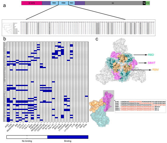 Structural organization of Spike protein and receptor-binding motif (RBM), phylogenetic analysis of VoCs, and interactions of nAbs with residues in RBM. (a) Organization of Spike protein domains and phylogenetic analysis of VoCs, highlighting mutations (yellow) in RBM. (b) Interactions of RBM residues (437–503) with ACE2 and human nAbs. (c) Tridimensional model of S protein trimer shows RBD (green), RBM (yellow), and synthetic peptide S8WT (magenta) comprising RBM tip portion.