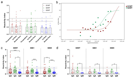 Evidently, mutations at the RBM region of Omicron BA.1 (S8BA1) and BA.5 (S8BA5) reduced the reactivity index mean and the number of positive samples (4/30 and 2/30, respectively). IgM levels were low and significantly different from IgG and IgA in single or heterologous doses of vaccinated individuals (Figure 2c,d). Additionally, some individuals with one dose of vaccine produced an IgA response to the RBM tip of the wild-type S (5/30) and a reduced response to Omicron BA.1 (2/30) and BA.5 (2/30) (Figure 2c). In the group of heterologous vaccination booster doses, only one sample had seroreactivity for IgG and IgA against wild-type sequence S8WT (Figure 2d). Mutations in Omicron variants reduced the reactivity index of this sample by almost three times.