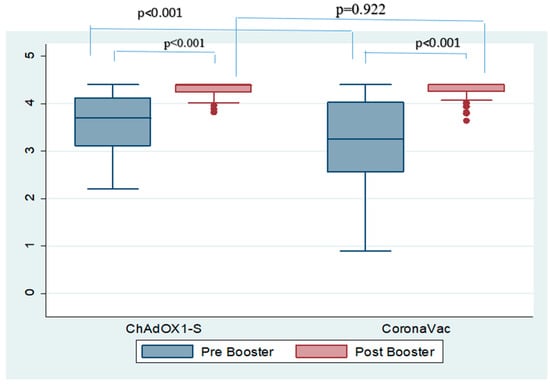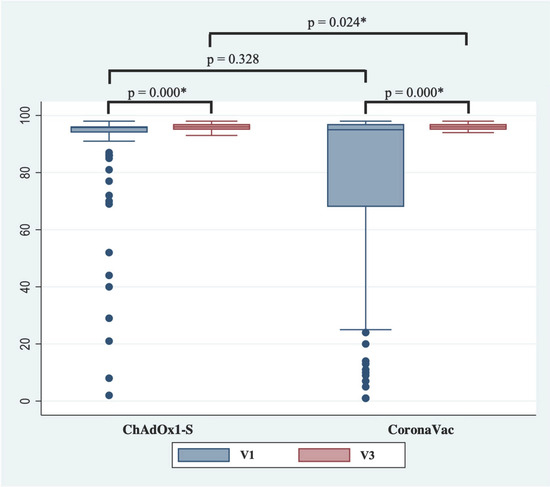 Figure 3 compares the sVNT inhibition capacity of ChAdOx1-S and CoronaVac®. No significant difference was found in the inhibition capacity measured with the sVNT antibody assay before the booster dose was administered between the ChAdOX1-S and CoronaVac® groups (p = 0.328). However, a significant difference was seen after the booster dose was administered between the two groups (p = 0.024).