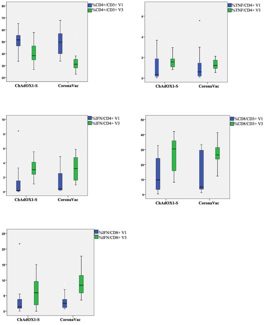 Regarding the T cell-mediated immune response to SARS-CoV-2, the CD4+ and CD8+ cell proportions, along with the proportions of AIM+ (activation-induced marker +) CD4+ cells, were recorded. Positive responses to spike antigenic stimulation occurred in the CD4+ or CD8+ compartment, with a significant increase in cytokine-producing cells among both CD4+ and CD8+ cells (Table 6 and Figure 4). In the CD4+ compartment, a significant increase was observed in IFN-producing cells and TNF-producing cells in both vaccine prime groups on day 28 of observation compared to the pre-booster status. However, no significant difference in IFN-producing cells (p = 1.00) on day 28 was observed despite the significant differences between the vaccine primes in the pre-booster analysis, with a higher proportion of IFN-producing CD4+ cells in the CoronaVac® group. The CD4+/CD3+ proportion was also found to be significantly lower at the V3 observation compared to V1 in both the ChAdOX1-S (p < 0.001) and CoronaVac® (p = 0.001) groups, with a further decline in the CoronaVac® group compared to the ChAdOX1S group (p = 0.002).
