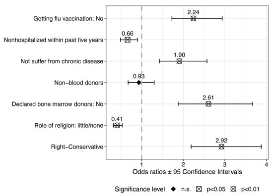 Figure 3 summarizes the results of five different reduced logistic models, with belief in anti-vax conspiracy theories as the dependent variable. All the covariates were added stepwise. Model 1 includes only flu vaccination, model 2 includes students’ medical history—hospitalization and suffering from chronic diseases, model 3 includes blood donation and bone marrow donation as covariates, model 4 includes the role of religion, and model 5 includes the political and normative orientation as the only covariate. In addition, the regression coefficients have been transformed using the exponential function; thus, a value greater than 1 (vertical dashed line) indicates that the predictor increases the likelihood of believing in anti-vax conspiracy theories. The shape of the points indicates whether the regression coefficient is statistically significant at p < 0.05 or p < 0.01, respectively.