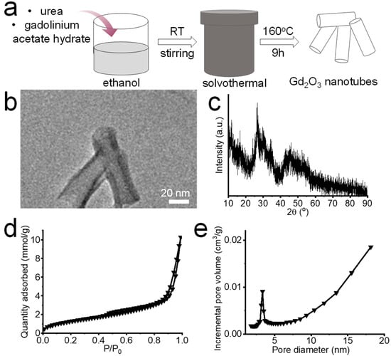 Gd2O3 nanotubes were synthesized by a facile one-pot solvothermal method using gadolinium acetate hydrate, urea, and ethanol (Figure 1a). The Gd2O3 nanotubes were about 70–80 nm in length and 20–30 nm in diameter (Figure 1b), and were composed of amorphous Gd2O3 without extra peaks caused by impurity phases, as shown by the XRD pattern in Figure 1c. Pore sizes of up to 18 nm were observed on the pore size distribution curve of Gd2O3 nanotubes (Figure 1d,e), which was consistent with the TEM image in Figure 1b.
