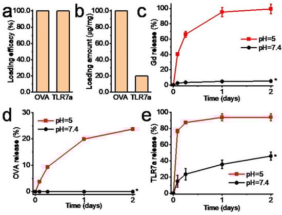 Biomolecule loading and release, and Gd2O3 nanotube degradation. OVA and TLR7a loading efficiency (a) and loading amount (b) on Gd2O3 nanotubes, pH-responsive Gd2O3 nanotube degradation (c), pH-responsive OVA, (d) and TLR7a (e) release from Gd2O3-OVA and Gd2O3-TLR7a, respectively (n = 3–4, * p < 0.05).