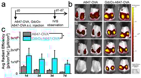 Gd2O3 nanotubes significantly prolonged A647-OVA retention around the injection site. Experimental procedure (a), IVIS images of A647-OVA in mice (b), radiant efficiency around injection site, and (c) 1, 2, 3 and 7 d after subcutaneous injection (n = 4, * p < 0.05).