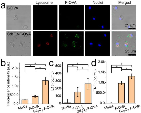 Gd2O3 nanotubes facilitated F-OVA cellular uptake and BMDC maturation in vitro. Representative confocal laser scanning microscope images of F-OVA and Gd2O3-F-OVA after culture with BMDCs with lysosome staining (a), fluorescence intensity of F-OVA after cellular uptake by BMDCs (b), IL1β (c), and TNFα (d) secretion levels from BMDCs (n = 6, * p < 0.05).