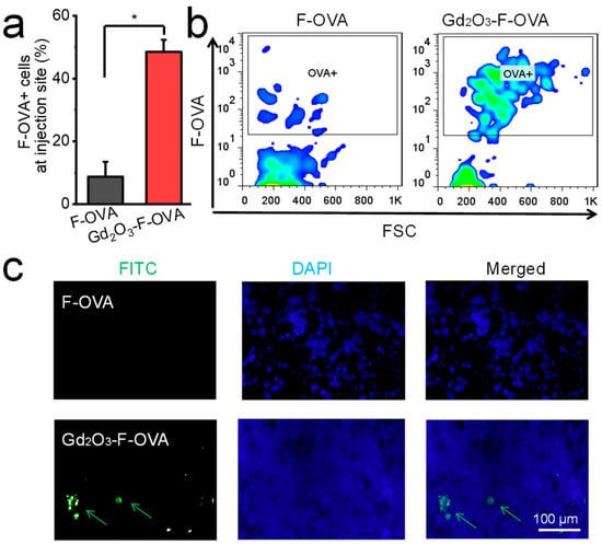 The Gd2O3 nanotubes increased the F-OVA cellular uptake efficiency in vivo. The percentages of F-OVA+ cells were 9% and 49% around injection site in mice 16 h after injection with F-OVA and Gd2O3-F-OVA, respectively (Figure 5a,b). The Gd2O3 nanotubes facilitated the delivery of antigens into nearby draining lymph nodes. Only weak antigen signals were detected in the nearby draining lymph nodes of mice injected with F-OVA. In contrast, higher antigen signal intensities were detected in the nearby draining lymph nodes of mice injected with Gd2O3-F-OVA than in those of mice injected with free F-OVA 16 h after subcutaneous injection (Figure 5c). Recent studies have demonstrated that the targeted delivery of immune potentiators is superior to the administration of their free forms. The delivery efficiency of immune potentiators to APCs and lymphoid tissues determines the quality of subsequent immune responses [,,]. In addition, the systemic circulation of immune potentiators may cause undesired toxicity []. Therefore, the Gd2O3 nanotubes that promote the uptake of immune potentiators by DCs and their transport to lymphoid tissues are critical for improving immunogenicity and reducing the off-target morbidity of immune potentiators.