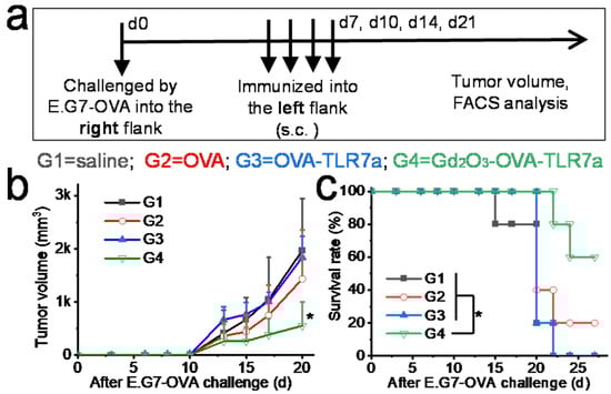 Gd2O3 nanotubes promoted anti-tumor immunity in mice. Experimental procedure (a), tumor volume (b), and survival rate (c) of mice administrated with G1: saline, G2: OVA, G3: OVA-TLR7a, and G4: Gd2O3-OVA-TLR7a (n = 5, * p < 0.05).