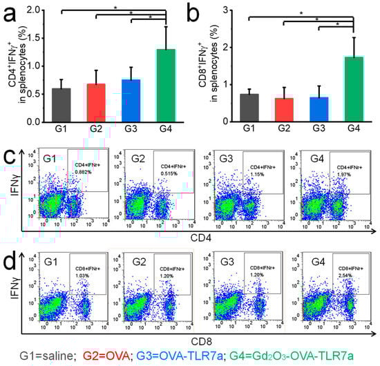 Gd2O3 nanotubes promoted IFNγ expression in splenocytes of mice. CD4+IFNγ+ T cell populations (a) and CD8+IFNγ+ T cell populations (b), representative flow cytometry plots of CD4+IFNγ+ T cells (c) and CD8+IFNγ+ T cells (d) at the endpoint (n = 5, * p < 0.05).