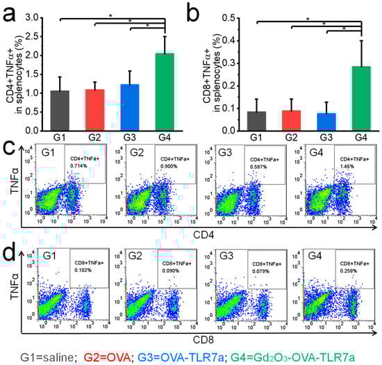 Gd2O3 nanotubes promoted TNFα expression in splenocytes of mice. CD4+TNFα+ T cell populations (a) and CD8+TNFα+ T cell populations (b), representative flow cytometry plots of CD4+TNFα+ T cells (c), and CD8+TNFα+ T cells (d) at the endpoint (n = 5, * p < 0.05).
