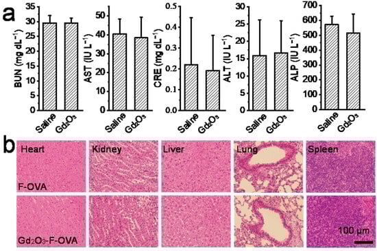The Gd2O3 nanotubes are biocompatible as shown by the blood biochemical tests and histological analysis (Figure 9). The BUN, AST, CRE, ALT, and ALP levels in mice injected with Gd2O3 nanotubes and saline were within normal ranges, with no significant differences (Figure 9a). Moreover, there was no marked difference in histological sections of the heart, kidneys, liver, lungs, and spleen of mice injected with Gd2O3-F-OVA and F-OVA, indicating no obvious toxicity of Gd2O3 nanotubes (Figure 9b).