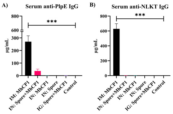 Experiment 1—Antigen-specific IgG concentrations in mice sera on day 42. Mice were vaccinated on day 0 and then received a booster immunization on day 21. The treatment groups were: intramuscular (IM:MhCP1), intranasal spore-bound antigen (IN:Spore+MhCP1), intranasal antigen only (IN:MhCP1), intranasal spore only (IN:Spore), oral/intragastric spore-bound antigen (IG:Spore+MhCP1), and control/naïve mice (Control). IgG specific to PlpE (A) and NLKT (B) are shown (mean ± SEM). *** p < 0.001.