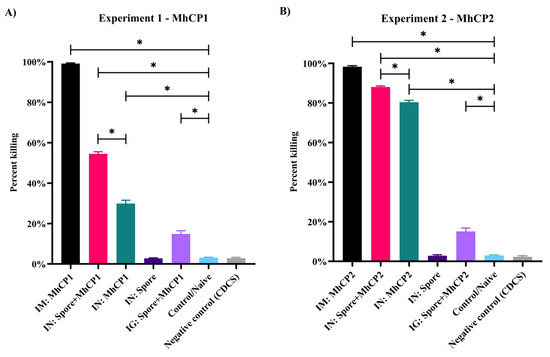 Serum bactericidal activity (SBA) assay, from samples collected on day 42. Antibodies present in the mice sera from Experiment 1 (A) and Experiment 2 (B) were assessed for their bactericidal activity against M. haemolytica through the complement-dependent SBA assay. Bactericidal activity from both experiments are shown for the following treatment groups: intramuscular (IM:MhCP), intranasal spore-bound antigen (IN:Spore+MhCP), intranasal antigen only (IN:MhCP), intranasal spore only (IN:Spore), oral/intragastric spore-bound antigen (IG:Spore+MhCP), and control/naïve mice (Control). The negative control in each SBA assay involved using only the complement source without the addition of antibodies (mice serum). * p < 0.05.