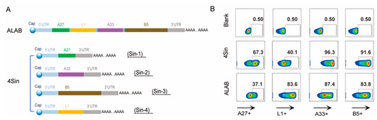 A conventional mRNA structure contains a cap structure, a 5’UTR untranslated region, a CDS translated region, a 3’UTR untranslated region, and a PolyA structure. Four VACV genes, A27, L1, A33, and B5 separated by modified P2A linkers, were inserted into the CDS translation region (Figure 1A) to result in the vaccine candidate mRNA, ALAB. Four mRNAs encoding A27, A33, B5, and L1 (sin1, sin2, sin3, and sin4) were also constructed, respectively, using the same mRNA backbone (Figure 1A). Mixing of equal amounts of sin1, sin2, sin3, and sin4 resulted in the second vaccine candidate mRNA, 4Sin (Figure 1A).