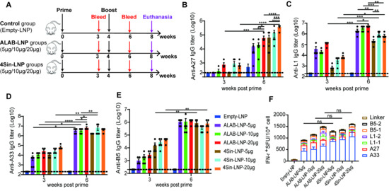 Immunogenicity of poxvirus mRNA vaccine candidates, ALAB-LNP, and 4Sin-LNP in mice. (A) Immunization schedule of mice (n = 5 for each group). The black, red, and purple arrows represent time points for immunizations, blood collection, and euthanasia; (B–E) Serum binding antibody titer against A27 (B), L1 (C), A33 (D) and B5 (E) at 3 or 6 weeks post-prime; (F) Cellular immune response in mice; Summary data are shown as means ± SEM; The dashed line indicates the limit of detection (LOD); Statistical significance was assessed by two-way ANOVA with Tukey’s or Sidak’s multiple comparisons test; p values were indicated by * (p < 0.05), ** (p < 0.01), *** (p < 0.001), or **** (p < 0.0001).