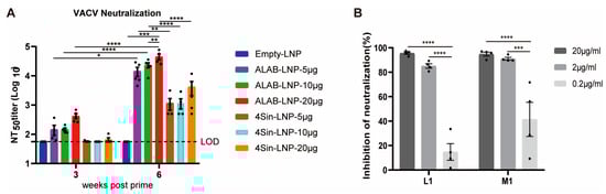 Neutralizing antibody against VACV induced by ALAB-LNP and 4Sin-LNP. (A) Serum VACV neutralization titer of mice immunized with ALAB-LNP or 4Sin-LNP at 3 or 6 weeks post-prime (n = 5 for each group); (B) Competitive inhibition of neutralization by VACV L1 protein and MPXV M1 protein; Summary data are shown as means ± SEM; The dashed line indicates the limit of detection (LOD); Statistical significance was assessed by two-way ANOVA with Tukey’s multiple comparisons test; p values were indicated by * (p < 0.05), ** (p < 0.01), *** (p < 0.001), or **** (p < 0.0001).