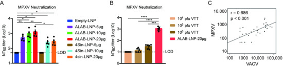 Cross-neutralizing activity against monkeypox virus. (A) Serum neutralizing activity of mice immunized with ALAB-LNP or 4Sin-LNP against monkeypox virus; (B) Significantly higher neutralizing activity induced by ALAB-LNP than smallpox live-attenuated vaccine, vaccinia Tian-tan strain (VTT); (C) Correlation of VACV neutralization assay and monkeypox neutralization assay (x-axis refers to VACV NT50 titer, y-axis refers to MPXV NT50 titer); Summary data are shown as means ± SEM; The dashed line indicates the limit of detection (LOD); Statistical significance was assessed by unpaired t-test; p values were indicated by * (p < 0.05), ** (p < 0.01), *** (p < 0.001), or **** (p < 0.0001). Correlation analysis was performed on SPSS.