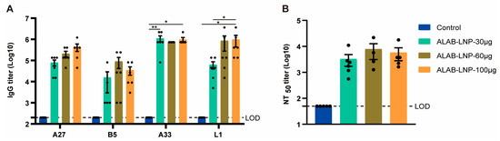ALAB-LNP mRNA vaccine candidate induced immunity in rats. (A) Serum binding antibody titer against A27, L1, A33, and B5 at 6 weeks post-prime; (B) Serum neutralizing activity of rats immunized with ALAB-LNP against VACV. Summary data are shown as means ± SEM; The dashed line indicates the limit of detection (LOD); Statistical significance was assessed by two-way ANOVA with Tukey’s multiple comparisons test (A) or unpaired t-test (B); p values were indicated by * (p < 0.05), ** (p < 0.01).