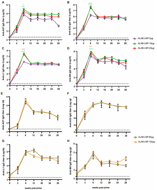 ALAB-LNP induced long-lasting binding antibody response against A27, A33, L1, and B5 proteins in mice and rats. (A–D) Specific IgG binding titers in sera from ALAB-LNP immunized mice against A27 (A), A33 (B), L1 (C), and B5 (D) proteins at different time points post-prime; (E–H) Specific IgG binding titers in sera from ALAB-LNP immunized rats against A27 (E), A33 (F), L1 (G) and B5 (H) at different time points post-prime; Summary data are shown as means ± SEM; The dashed line indicates the limit of detection (LOD); Statistical significance was assessed by two-way ANOVA with Tukey’s multiple comparisons test (A–D) or Sidak’s multiple comparisons test (E–H); p values were indicated by * (p < 0.05), *** (p < 0.001), or **** (p < 0.0001).