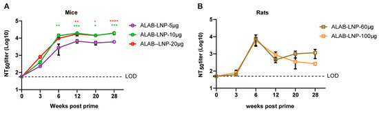 ALAB-LNP induced a long-lasting neutralizing antibody response against VACV in mice and rats. (A) Serum neutralizing activity of ALAB-LNP immunized mice against VACV at different time points post-prime; (B) Serum neutralizing activity of ALAB-LNP immunized rats against VACV at different time points post-prime; Summary data are shown as means ± SEM; The dashed line indicates the limit of detection (LOD); Statistical significance was assessed by two-way ANOVA with Tukey’s multiple comparisons test (A) or Sidak’s multiple comparisons test (B); p values were indicated by * (p < 0.05), ** (p < 0.01), *** (p < 0.001), or **** (p < 0.0001).